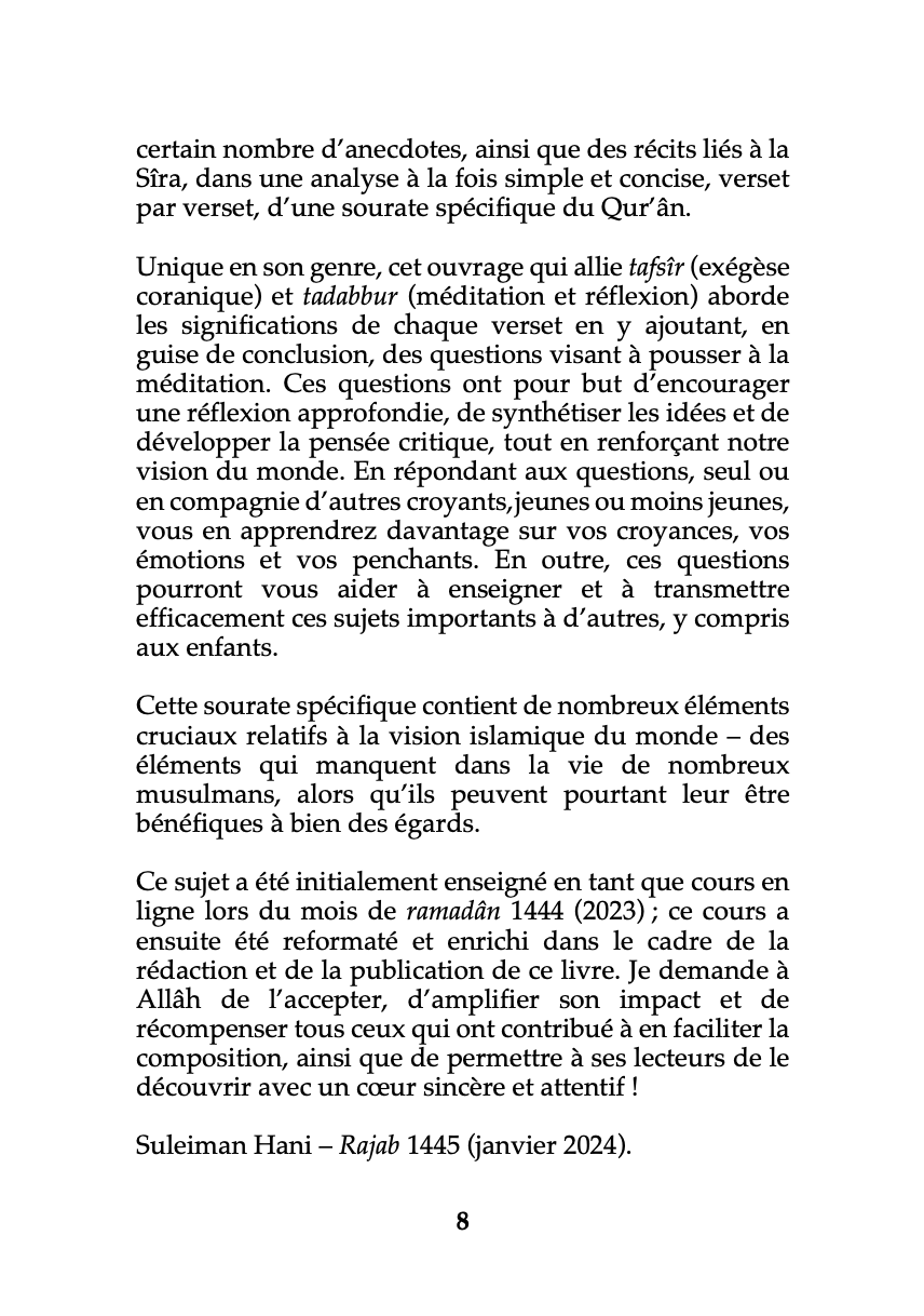 Unique en son genre, cet ouvrage qui réunit tafsîr (exégèse coranique) et tadabbur (méditation) aborde les significations de chaque verset en y ajoutant, en guise de conclusion, des questions qui poussent à la réflexion et permettent de synthétiser les idées et de développer la pensée critique.