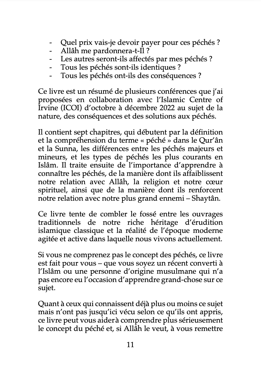 Dans ce livre, l’auteure nous invite à nous arrêter un instant pour méditer et réfléchir à notre mode de vie contemporain. À envisager la possibilité qu’involontairement, ou par oubli ou insouciance, nous puissions commettre des actes qui déplaisent à Allâh – des actes de désobéissance. À réaliser que même notre ignorance peut avoir des conséquences très concrètes, non seulement dans l’Au-delà, mais aussi dans notre vie quotidienne, dans notre relation avec Allâh, avec les gens qui nous entourent et le monde en général.