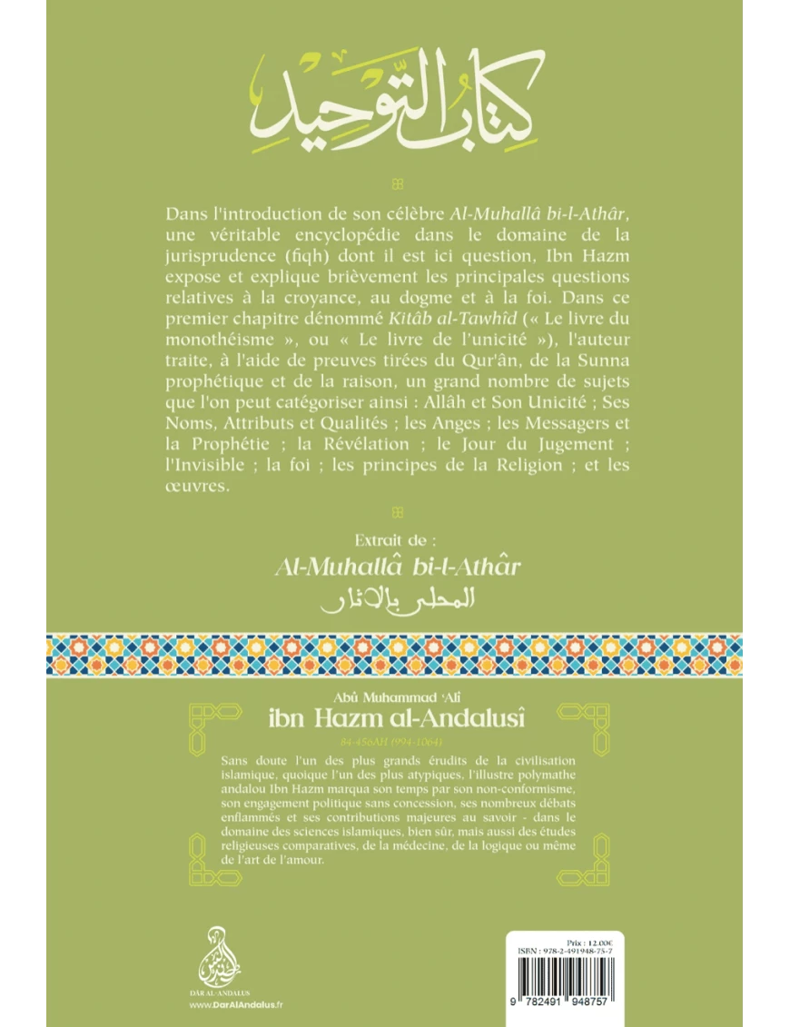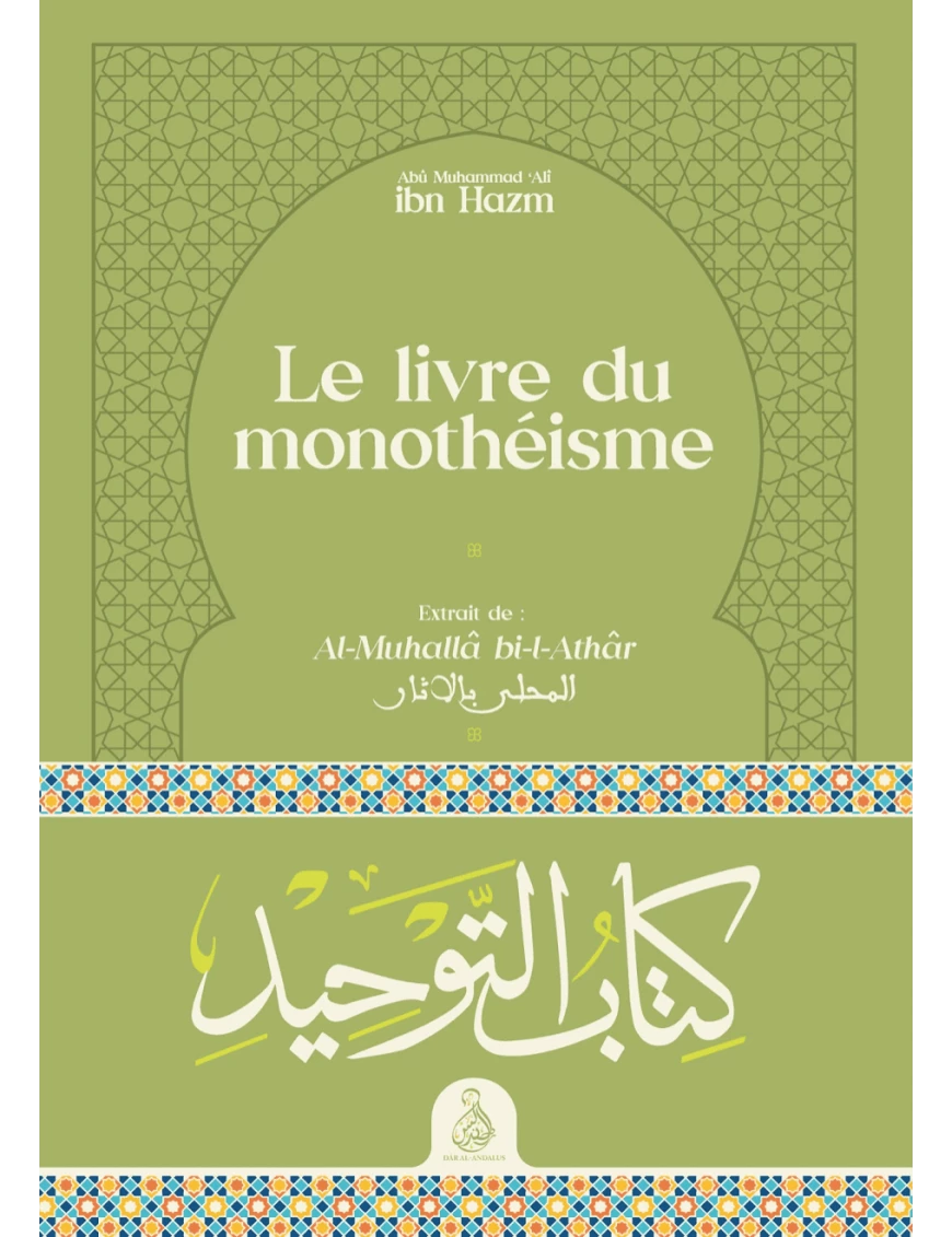 Résumé : « Dans l’introduction de son célèbre Al-Muhallâ bi-l-Athâr, une véritable encyclopédie dans le domaine de la jurisprudence (fiqh) dont il est ici question, Ibn Hazm expose et explique brièvement les principales questions relatives à la croyance, au dogme et à la foi. Dans ce premier chapitre dénommé Kitâb al-Tawhîd (« Le livre du monothéisme », ou « Le livre de l’unicité »), l’auteur traite, à l’aide de preuves tirées du Qur’ân, de la Sunna prophétique et de la raison, un grand nombre de sujets que l’on peut catégoriser ainsi : Allâh et Son Unicité ; Ses Noms, Attributs et Qualités ; les Anges ; les Messagers et la Prophétie ; la Révélation ; le Jour du Jugement ; l’Invisible ; la foi ; les principes de la Religion ; et les œuvres. »