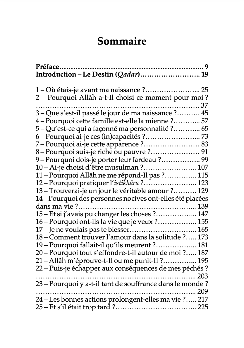 Nous sommes nombreux à nous poser ce type de questions sur le Destin et le Décret divin (Qadar), le pilier de l’Islâm sans doute le moins bien compris : dans cet ouvrage, Omar Suleiman répond aux 30 interrogations les plus courantes à ce sujet avec son style habituel, pédagogique et facile d’accès.