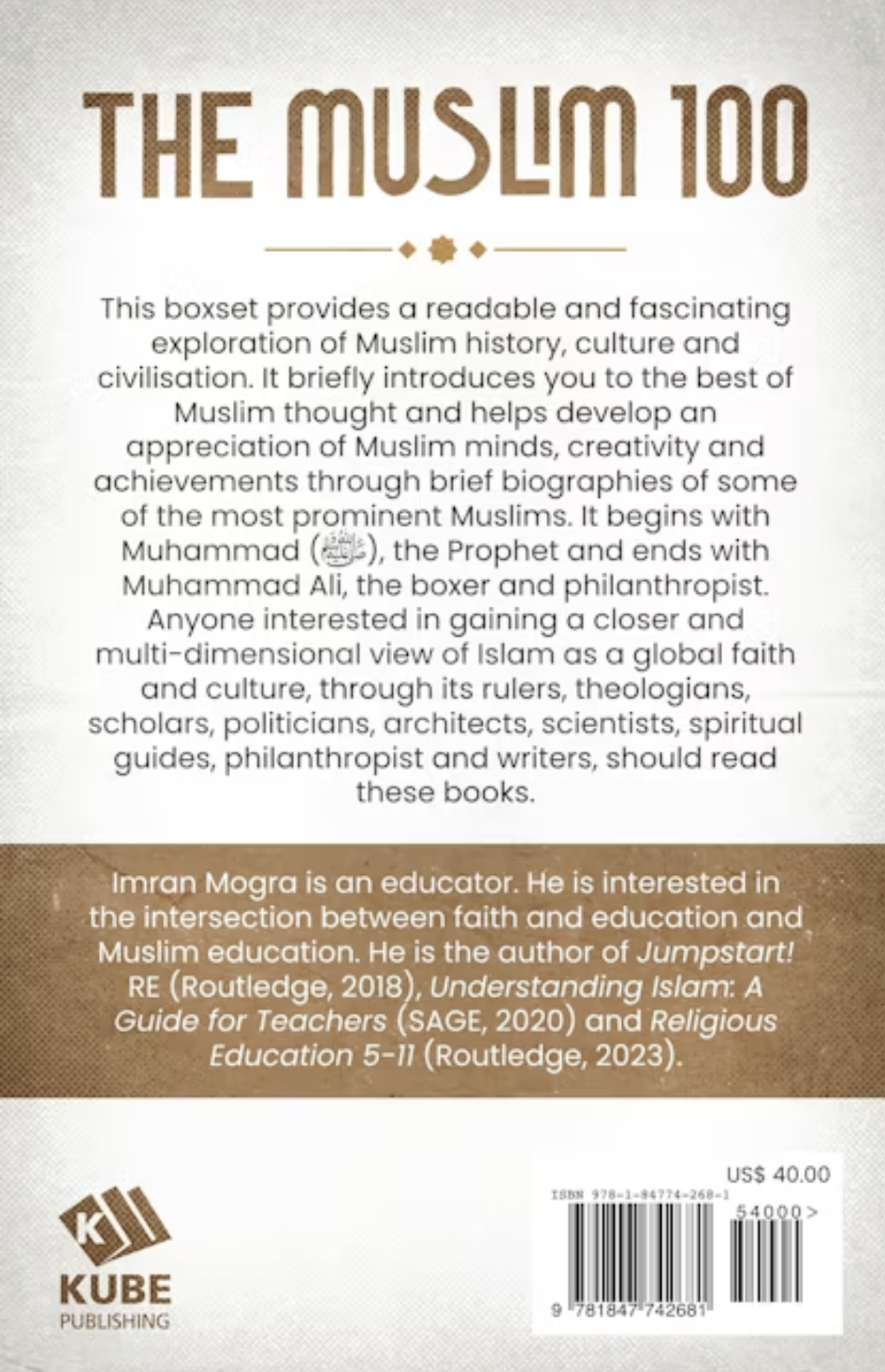 This boxset provides a readable and fascinating exploration of Muslim history, culture and civilisation. It briefly introduces you to the best of Muslim thought and helps develop an appreciation of Muslim minds, creativity and achievements through brief biographies of some of the most prominent Muslims. It begins with Muhammad ﷺ and ends with Muhammad Ali, the boxer and philanthropist. Anyone interested in gaining a closer and multi-dimensional view of Islam as a global faith and culture, through its rulers, theologians, scholars, politicians, architects, scientists, spiritual guides, philanthropist and writers, should read this series!